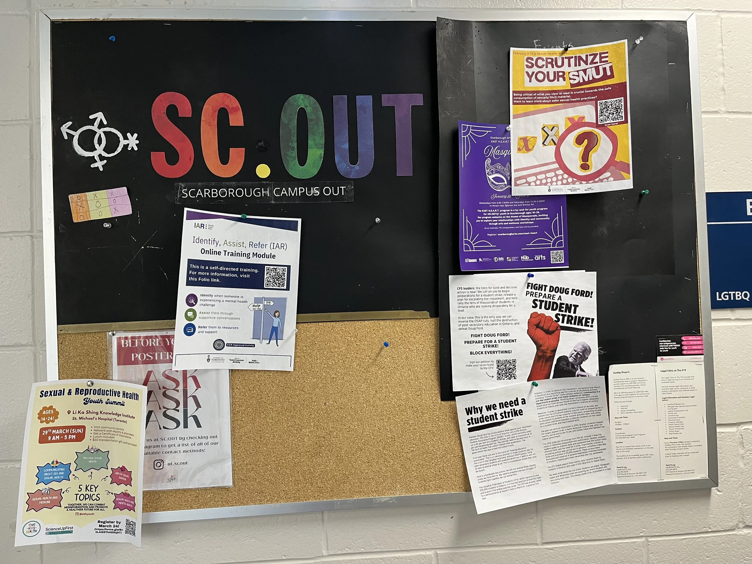 Bulletin board outside student-run queer space by Scarborough Campus OUT (SC:OUT) on campus (Photo By: Vyusti Shroff // The Underground).