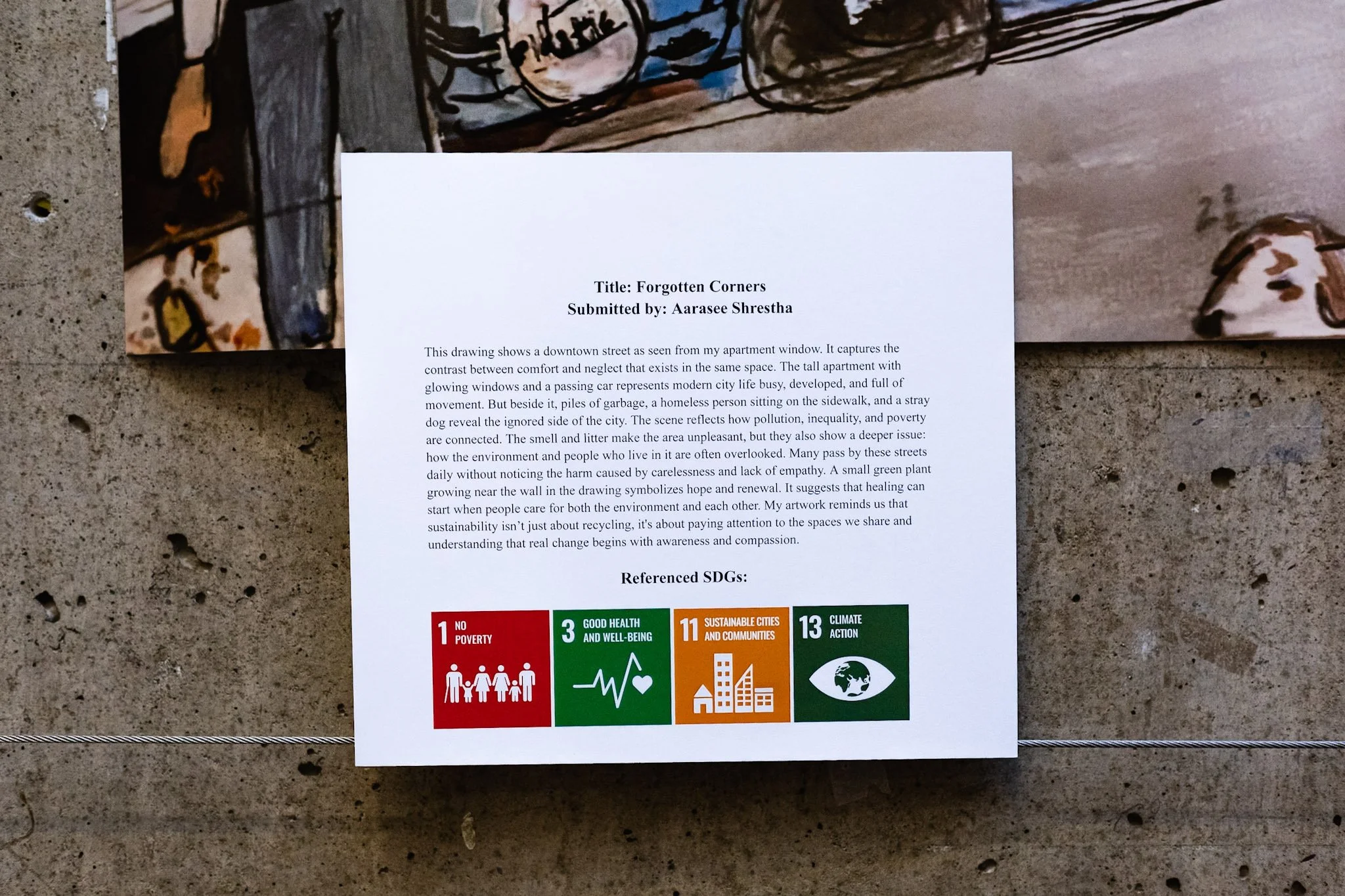 Aarasee Shrestha’s write-up on how her submission compliments the UN SDG’s, referencing their importance. (Photo credits: Neil Patel)