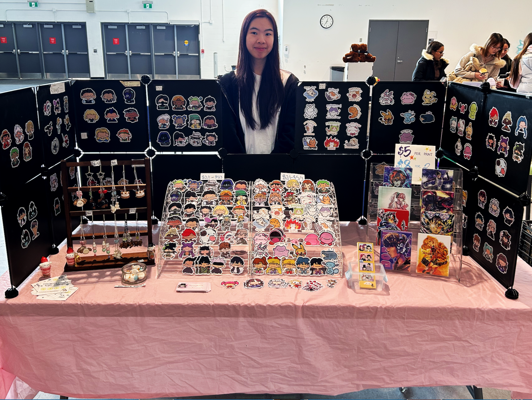 On the other side of the venue, among stickers and art prints stood Hannah Chan, a first-year student at UTSC, who set up her stall, Sleepyhinaa, on the right block of tables. Hana has been selling her art and taking part in markets since she was in the 8th Grade. This market was her third one on campus; however, she has been part of many other school markets. She confessed that she was happy to be able to show her art to others.
